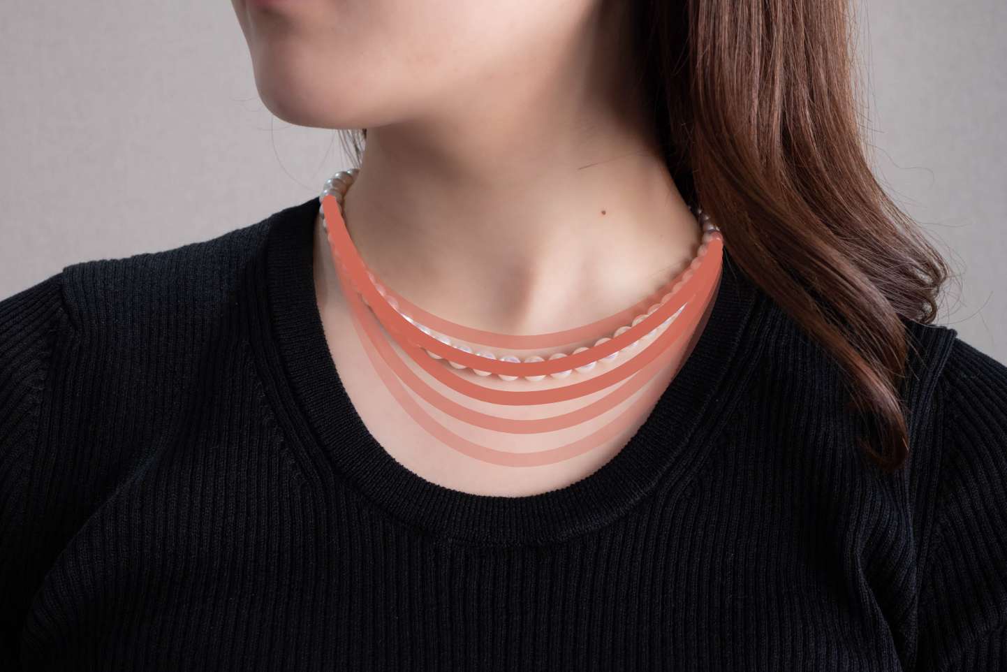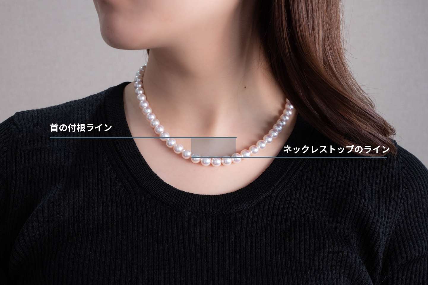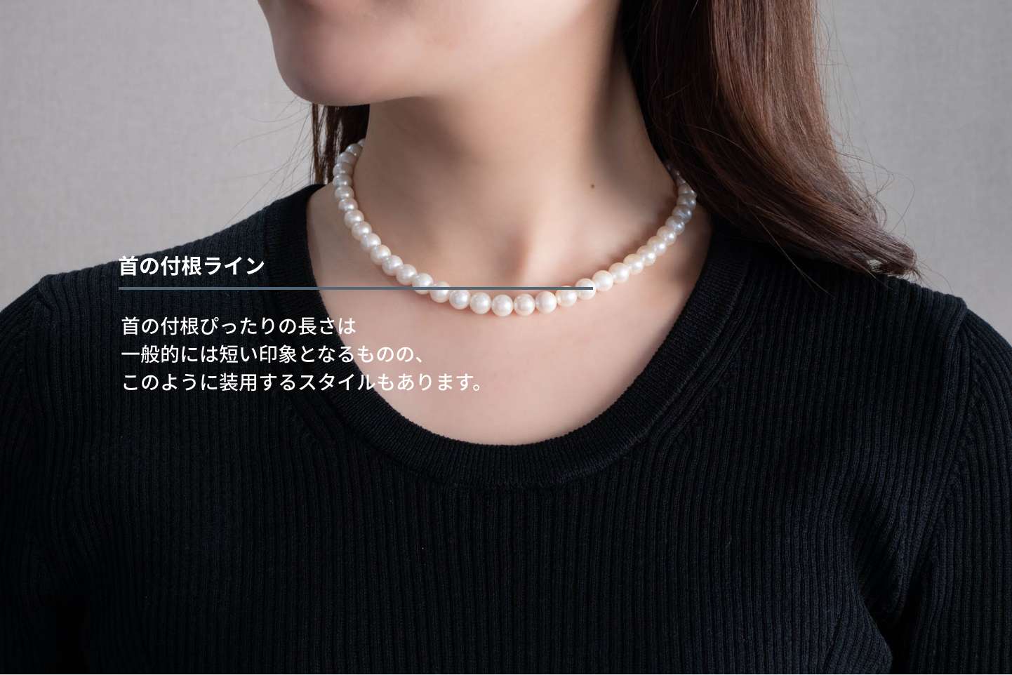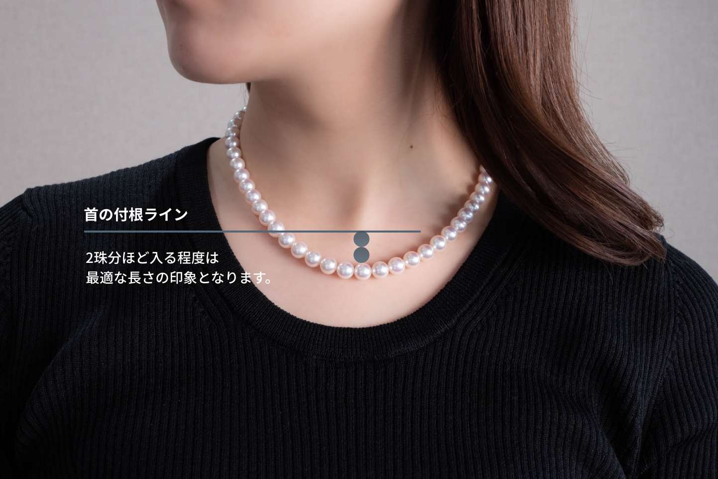 首の付根からネックレストップまでの間に1〜2珠入る程度が、短すぎず・長すぎずの長さの目安ですので、ぜひご参考ください。