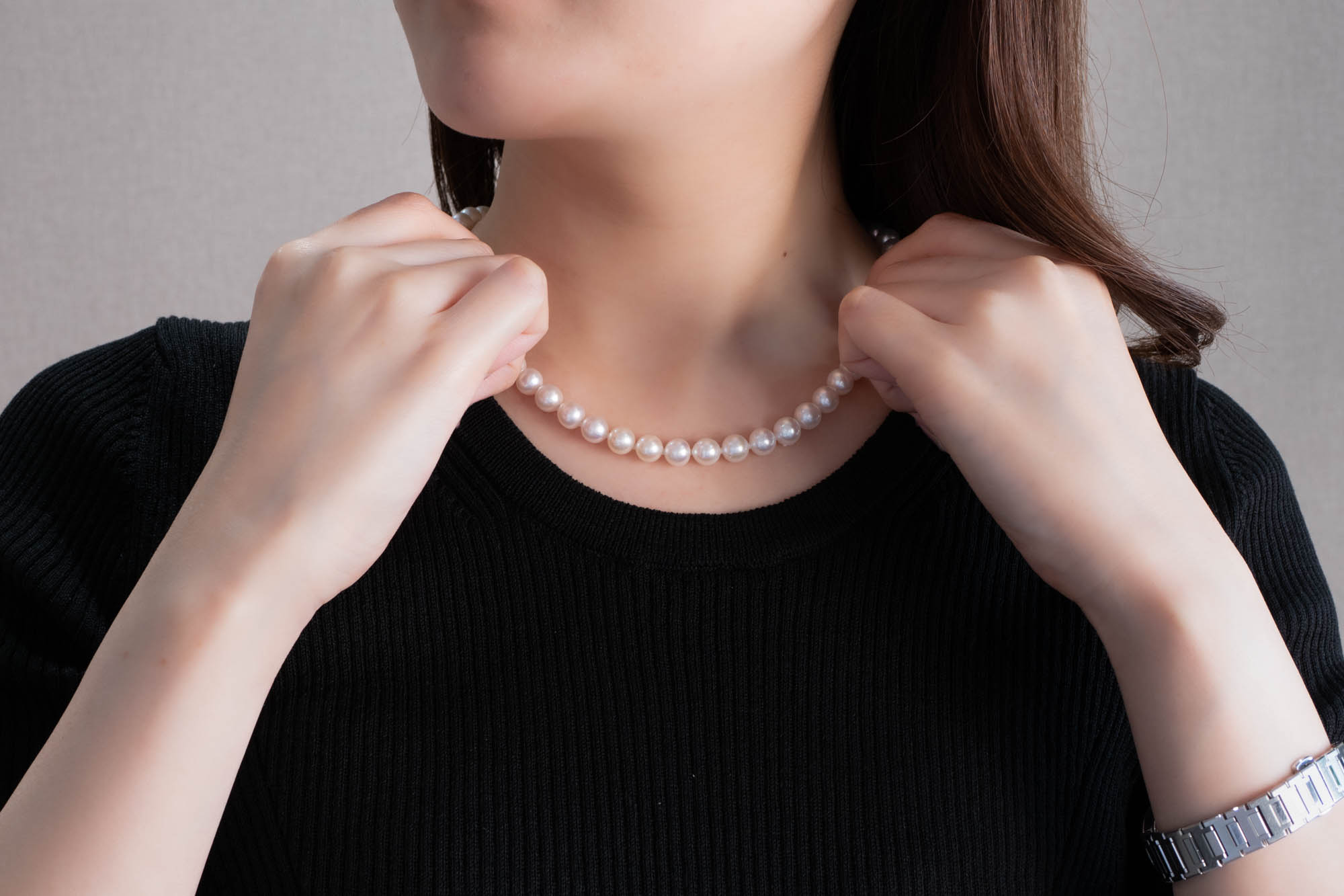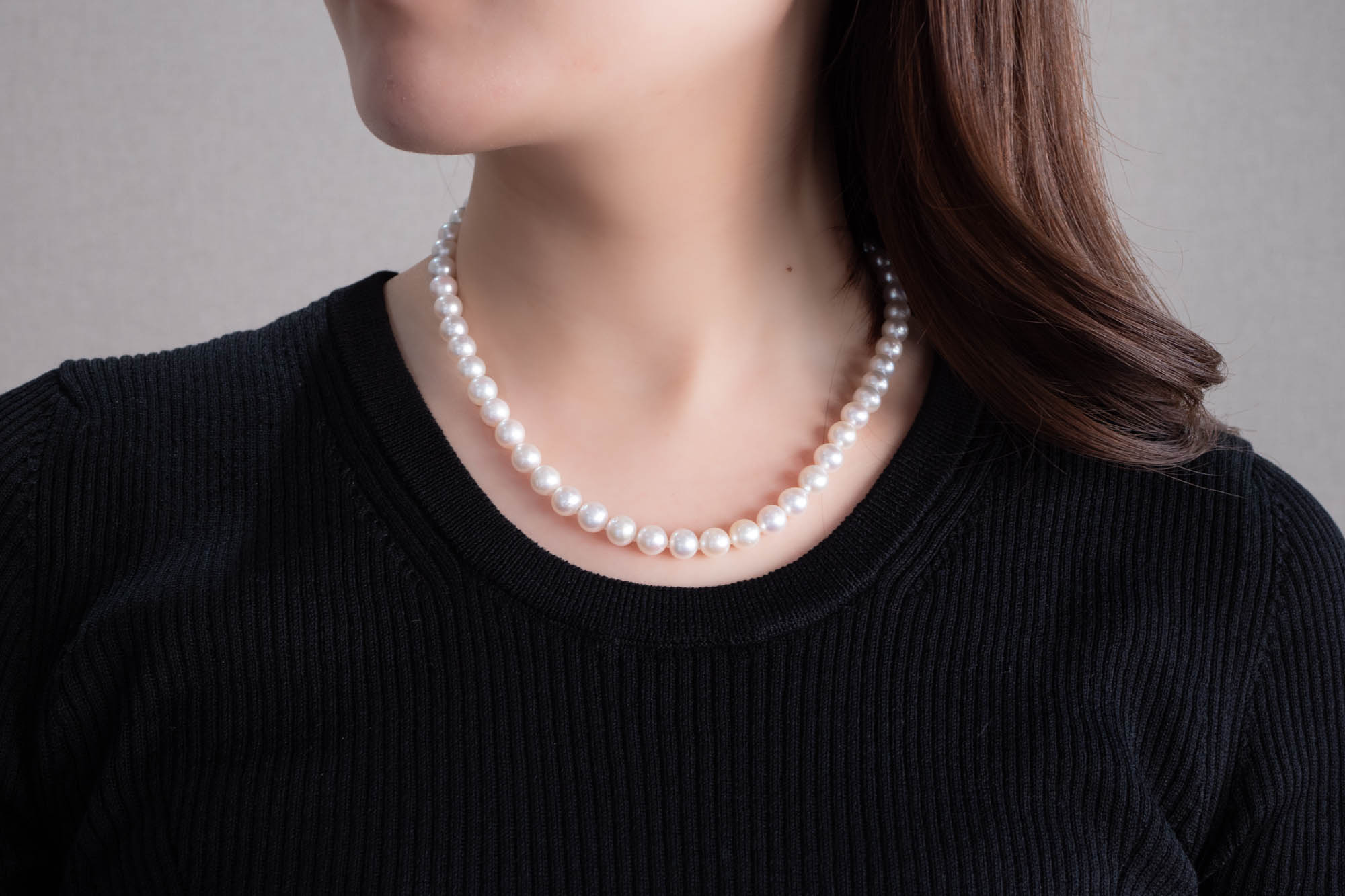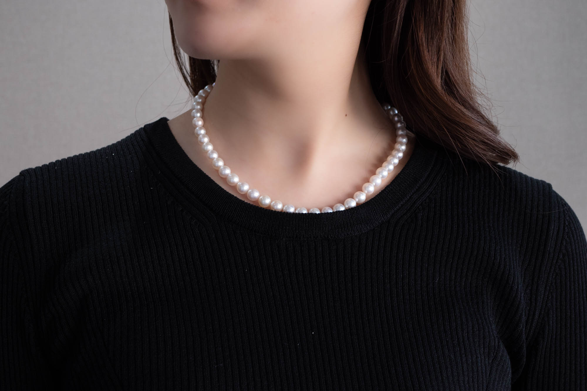 真珠の場合、仮に短くしたとしても「失礼」「だらしない」という印象になる事はありません。過度な短さによって首の付け根よりも上になるようなフィッティングはファッション性が高くなり着用シーンが限られますが、付け根に沿うような長さはウェディングなどでもよく用いられます。
