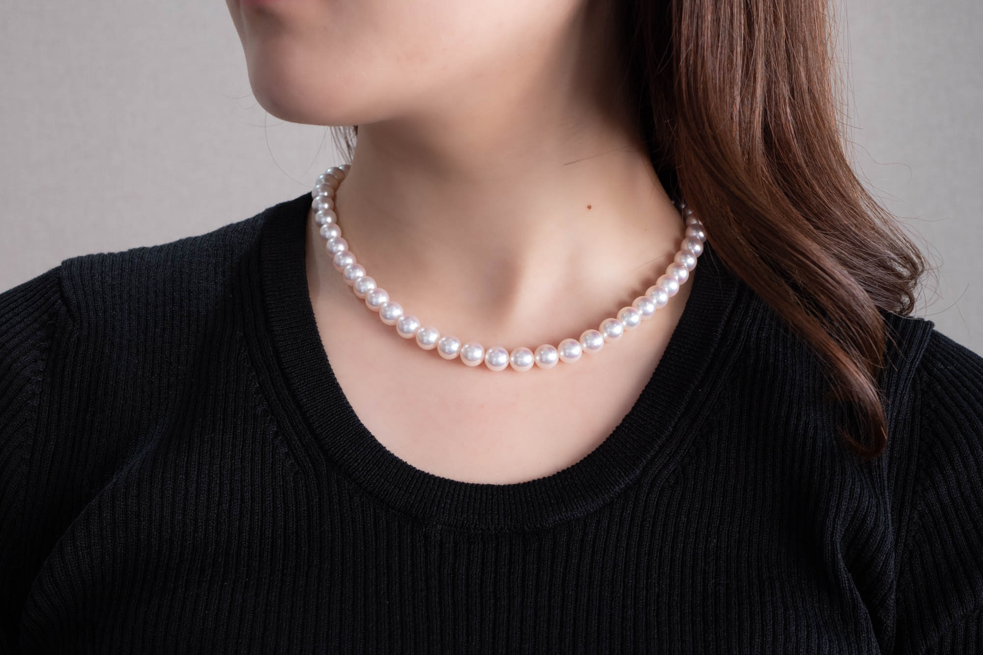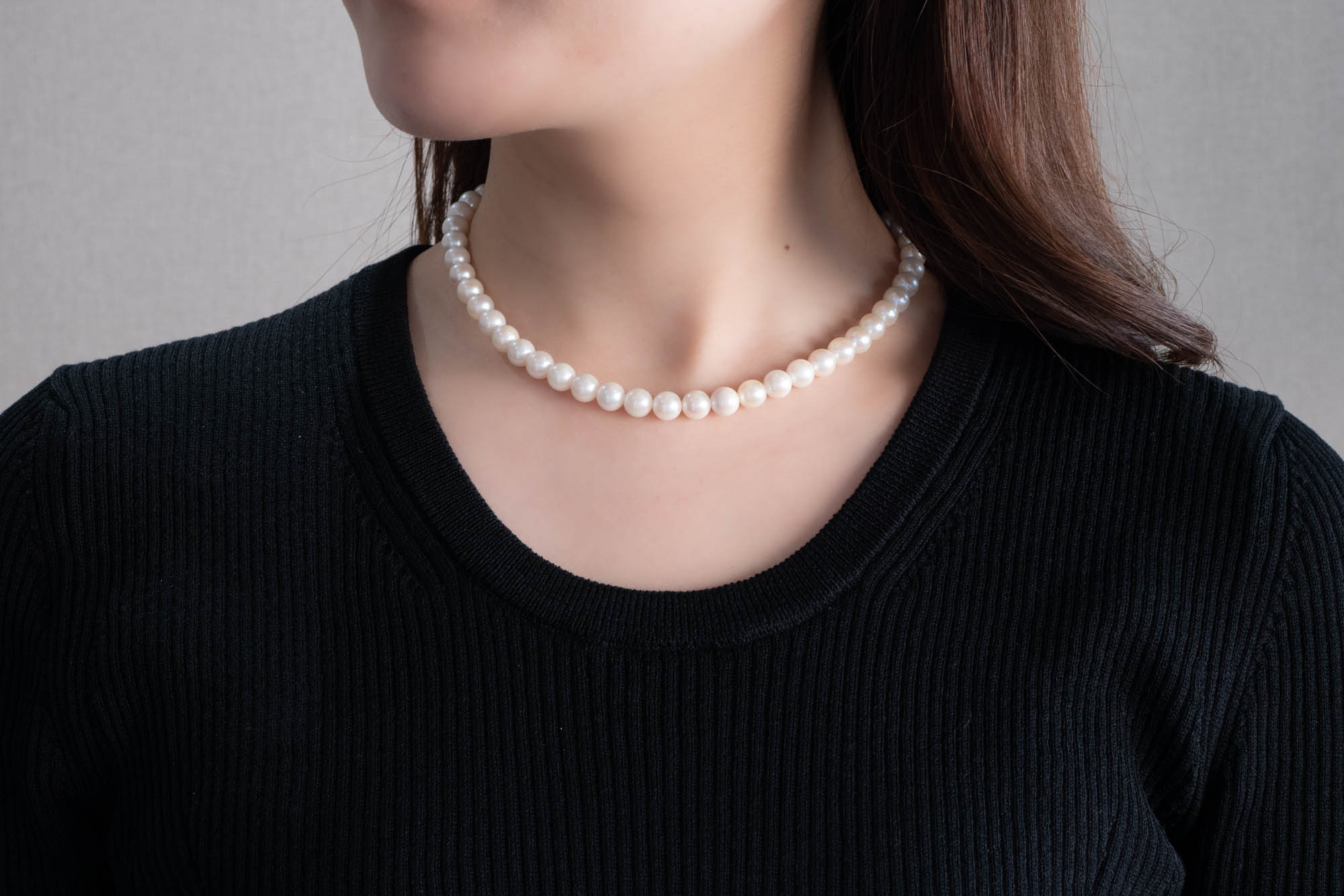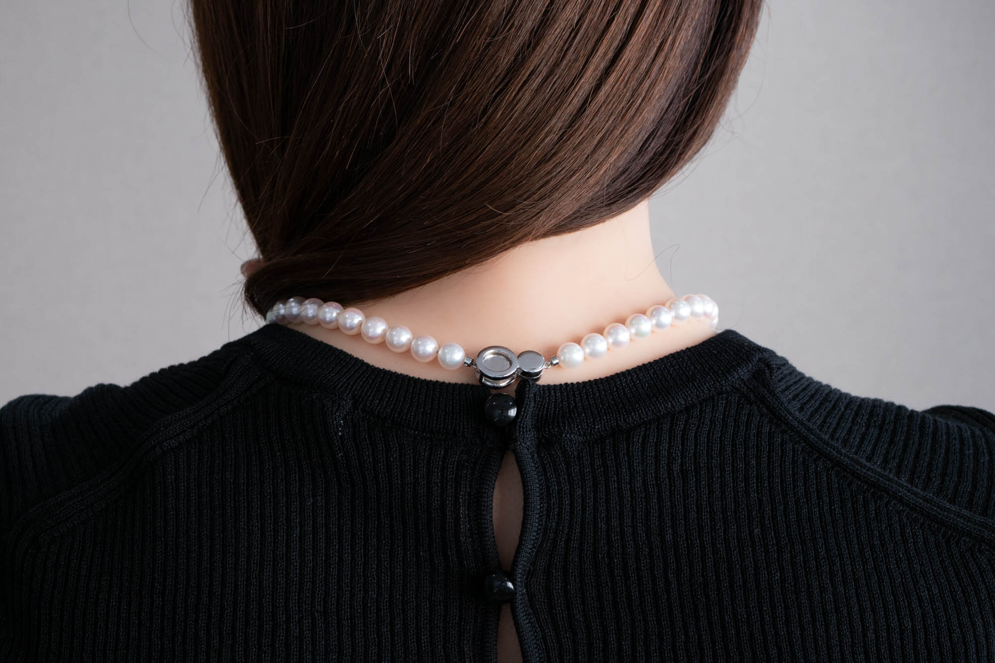 真珠の場合、仮に短くしたとしても「失礼」「だらしない」という印象になる事はありません。過度な短さによって首の付け根よりも上になるようなフィッティングはファッション性が高くなり着用シーンが限られますが、付け根に沿うような長さはウェディングなどでもよく用いられます。