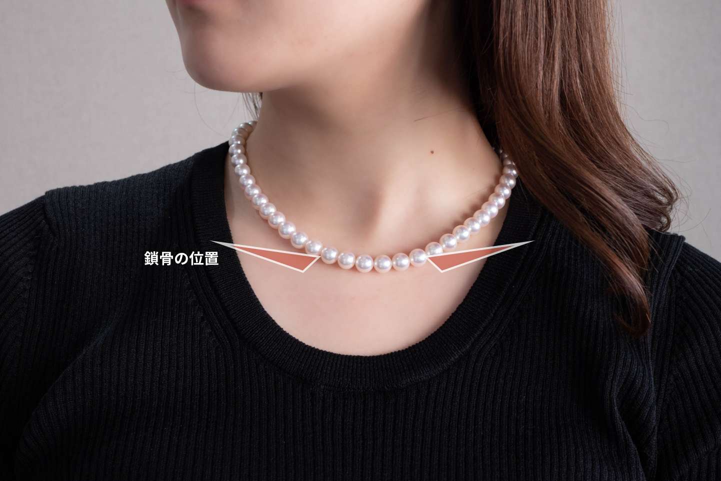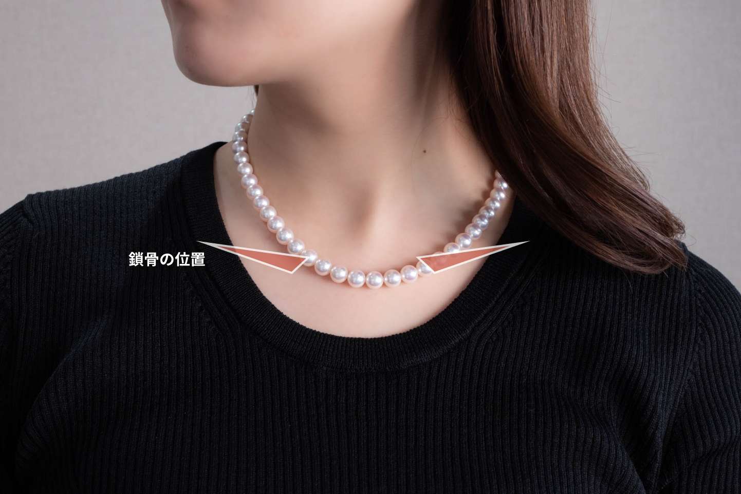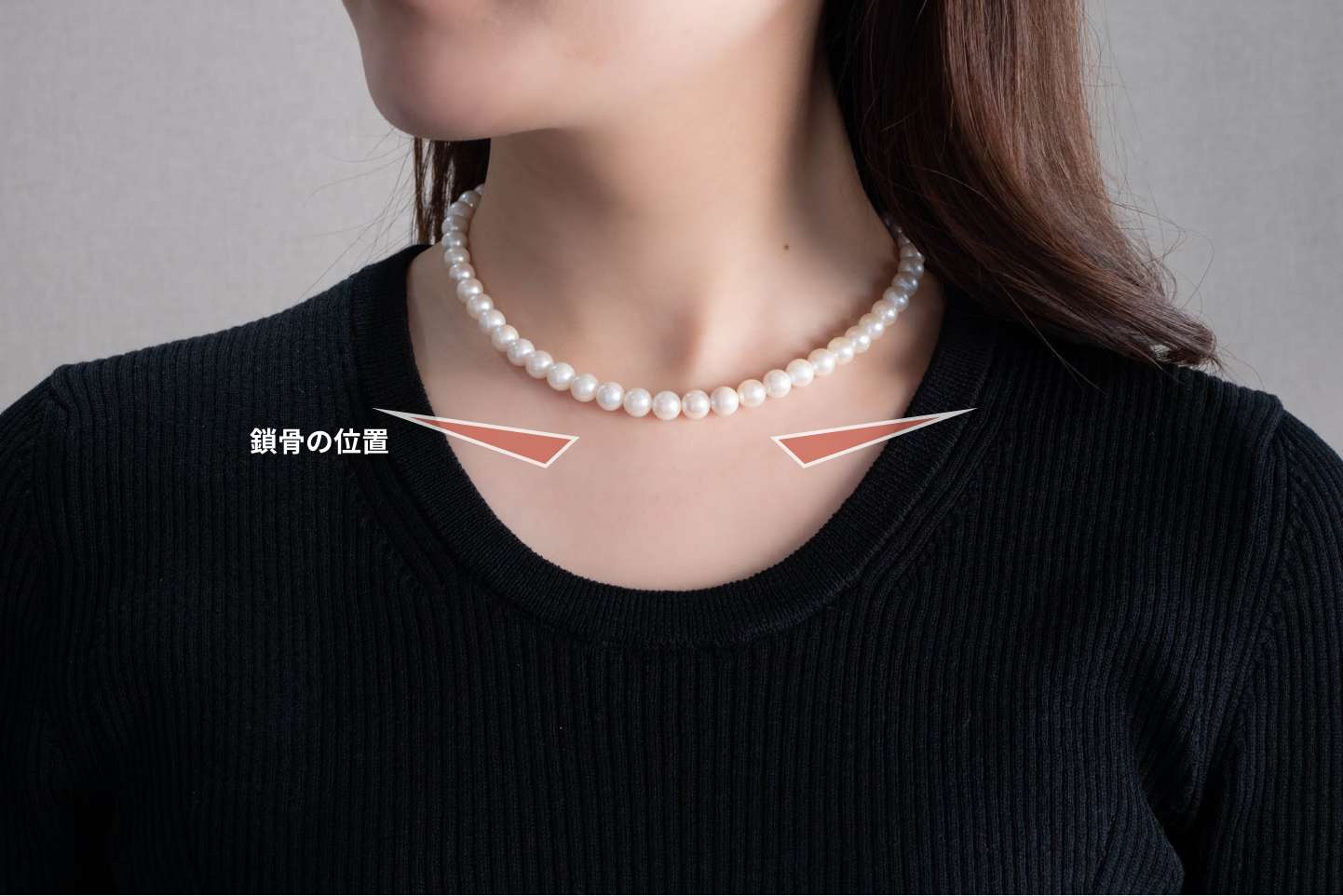 そしてもう一点が、鎖骨の間にかかる珠の個数です。長さの印象はここでも大きく左右される場合があります。ただし、鎖骨の位置、大きさは個人差が大きく、鎖骨同士が離れている方・鎖骨が下寄りにある方など様々です。特に鎖骨が目立つ方には、一つの目安としてご参考ください。