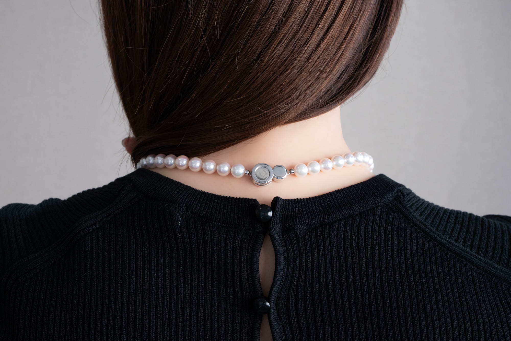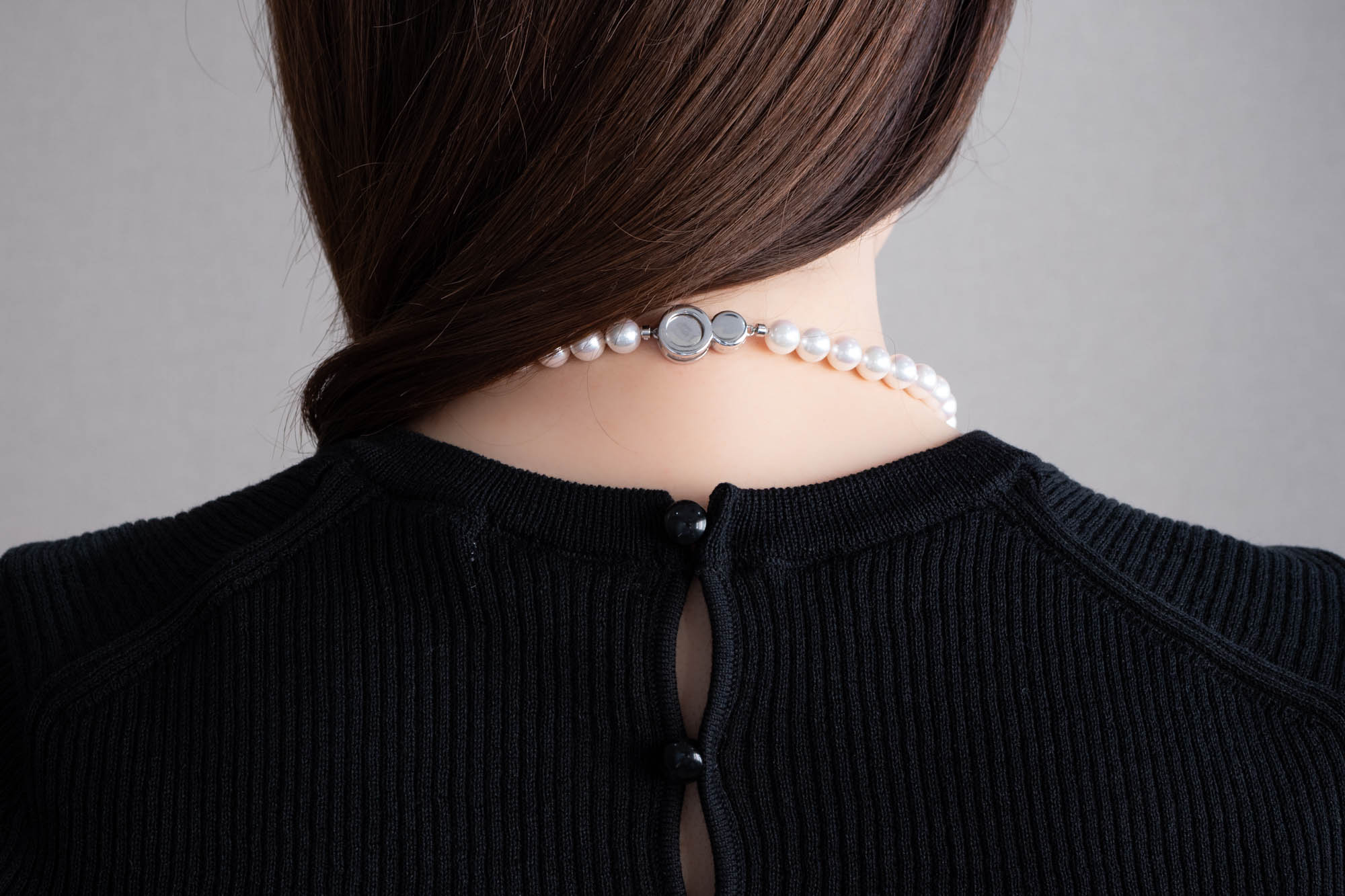 この時、単純に「距離(cm)」で見るのではなく、ご着用頂いている真珠の「珠」が何個分入るかという観点で見ます。なぜなら、大きい珠/小さい珠によって印象が異なるため、絶対的な距離では定める事が難しく、真珠の大きさとの相対的な距離が印象を決めるにあたって大切になるからです。このとき、付け根からネックレストップの間に「1〜2珠ほど」入る距離感が「長すぎず・短すぎない」適度な長さであると考えています。(個人差はあります)
