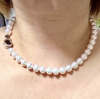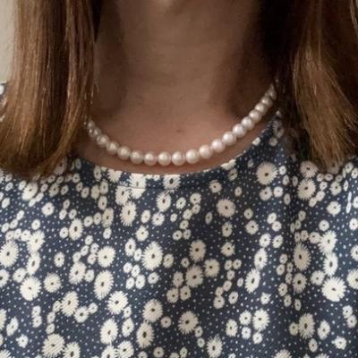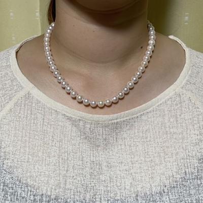 とてもきれいな真珠のネックレスです。 店舗で実物を見て、触って、説明を受けて購入しました。 法事用でしたが身に付けていると気分が上がるので普段着でも使用しています。 留具がおしゃれでとても気に入っています。 こんなにきれいな真珠をありがとうございました。