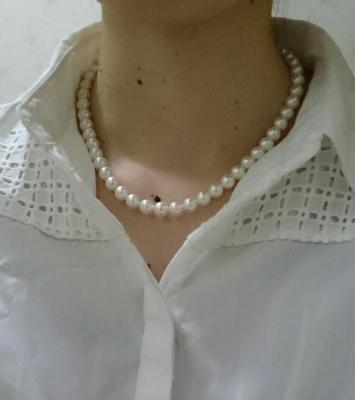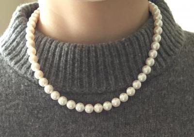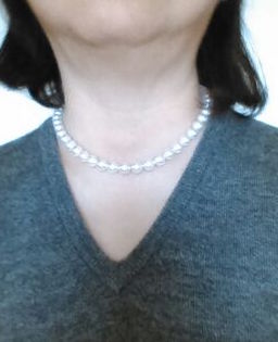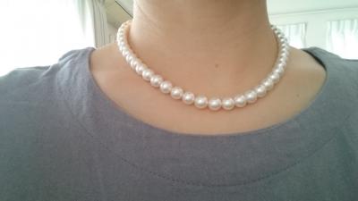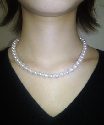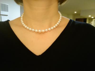 自由内覧日に伺いました。一瞬、ショールームの、品数の多さに圧倒され、この中から一本を選ぶなんて無理かもと思ったのですが、店長さんが丁寧に対応してくださり、選ぶ事が出来ました。 後日、届いた品物を見て改めてその美しさに、うっとり純白の輝き、内側からの言葉では表現出来ない光彩、ネックレスは勿論の事、ピアスの美しさはいつまでも見ていたい程です僅かにあるエクボは、本真珠の証と納得しています 又、無料糸かえをお願いした手持ちのネックレスも見違えるほど美しく仕上げて頂きました。夫も、良い買い物をしたねと言ってくれました。