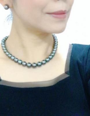 思った以上に大きく感じました。 他のレビューで最大が10mm前後の物だと小さく感じると言うのを見ていた事もありサイズ大き目で選びました。 カラーは高級と言われるオーロララグーン系ではありませんがピーコックグリーンとグレー系の中間と言う感じでむしろ好みはグレー系だったので、エクボもほとんど無い綺麗な真珠で満足しています。 最初は30万円~40万円でもっと小さなピーコックグリーン系の物を他店で検討していましたが傷もサイズも妥協品でした。 この商品に決めて本当に正解でした。