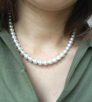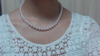 友人の結婚式と30歳を過ぎたこともあり、ちゃんとしたものを持ちたいと思い購入しました。 ホワイトグリーン系とホワイトピンク系のどちらがいいかすごく悩みましたが、 年齢を重ねても使いやすそうなホワイトグリーン系にしました。(金額もこちらのほうがお安いこともありましたが) 届いて見てみると、ピンク系が届いたのかと思うぐらい淡いピンク色に見えました。 自然光の 下で再度見ると、少しだけグリーンも見えました。 よく見ると小さい傷というか凸凹したものもありますが、 じっと見ないとわかりません。 結婚式につけていくのが楽しみな、きれいでかわいらしいネックレスでした。 思い切って購入してよかったです、大切に使っていきたいと思います。 ありがとうございました。