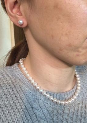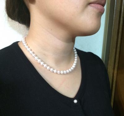 会社の同期の結婚式につけようと思い、真珠のネックレス・ピアスのセットを探していました。年齢的に購入するなら本物をと考え、ネットで色々なお店を見たり実際にデパートや他のお店の品物も見に行ったりしていました。 こちらのお店はネット上でも分かりやすい説明と画像が掲載されていて、綺麗な真珠だなと思っていたのですが、自由内覧日で見た沢山の真珠のネックレスはさらに美しく、逆に迷ってしまって決められないという結果に(笑)。 もうこれは予算で決めるしかないと考え、ネットで良いと思った物を注文させていただきました。ネックレスのクラスプだけでなくピアスの金具も希望通りチタンに加工してもらい、本当に感謝しています。届いた商品は予想通り美しくうっとりしてしまうものでした。同期の結婚式が楽しみです。