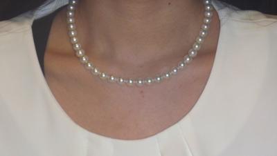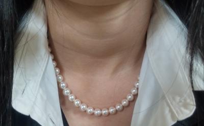 真珠の粒か綺麗に揃っていて、とても美しい商品でした。デパートで見た同じぐらいの品質の商品(鑑定書の評価がほぼ同じぐらいでした)よりかなりお安く手に入れられたと思います。 長さ調整をして頂けるようなので、少し短くしようかと思っているところです。