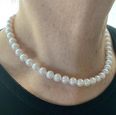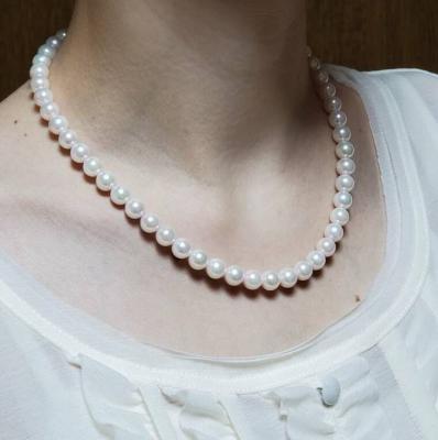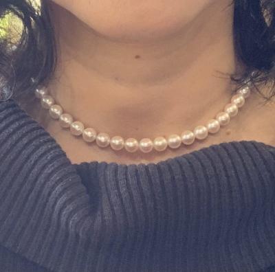 真珠のネックレスを用意したくて真珠について調べてインターネットのいろんなところの商品を探しながら悩んで貴社の製品を選びました。 やはり高価な真珠があまりにもきらびやかで美しく見えて大丈夫かと心配になりましたが、なんと! 小さな傷がありますが、近くで注意深く見ない限りは見えず、白ですが、少しピンク色がかっているのがとてもきれいです。 写真で十分に表現されていない点が残念です。 一緒に来たピアスもとてもきれいです。ネックレスの長さは41センチで注文しましたが、体格が小さい私にとてもよく似合います。 良い製品を購入できてうれしいです。 ありがとうございました!