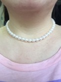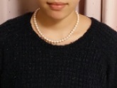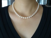 10数年前に母から贈られた真珠のネックレスが、珠も小さく傷やえくぼが目立つため、買い替えを検討していました。 予算は10万円でしたが、ショッピングモールや百貨店で探すと、花珠は20万円を超えるような品物ばかり。 ネットでも何店舗も比較しましたが、こちらのお店が商品説明も詳しく、写真も見やすかったため、第一候補に。 品物を手にとって見られないネットなので、色々とお店の方にメールで質問させていただきましたが、丁寧に返信いただけて、安心することができました。 流行のホワイトピンクは、これから年を重ねることを考えると、若すぎるように感じ、クリーム系で探していました。 予算の中で、できるだけテリの良いもの…ということで、こちらの商品に決めました。 実際届いた商品は、丁寧に梱包され、大事に出荷されていることが伝わりました。 顔に近づけてまじまじと見ると、針の先で突いたような小さなえくぼが数珠見られましたが、テリが強いため、身につければ全くわかりません。 今まで持っていた真珠とは、まるで違う輝きがあり、気に入りました。 クリーム系といっても、ほんの少しクリーム寄りという色なので、身に付けると肌にしっとりとなじんで、とてもキレイです。どうして日本ではクリーム系が人気がないのでしょうね? 実際身に付けると、肌が黄色身をおびている日本人には、とても似合う色だと思います。 その分、クリーム系ならホワイト系より珠質の優れたものがお安く手に入るようなので、得した気分です。