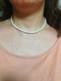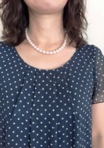 着用写真だとわかりにくいかもしれませんが、見る角度によってピンクにもグリーンにも見える綺麗な真珠です。着用する前は、ちょっとサイズが小さかったかな…とも思いましたが、実際に着用してみたところ、ピアスもネックレスもちょうど良い感じでした。 49日法要に出席したのですが他の方々の真珠よりもテリが良く、綺麗で嬉しくなっちゃいました。 着用後のお手入れ用のクロスやケースも気に入ってます。購入 前の電話対応の際もご丁寧にお付き合いくださり、ありがとうございました。