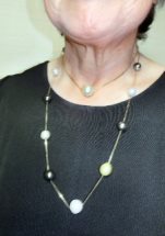 インドネシァ産白蝶真珠これも珠、全体に薄いシャンパンカラーの中にピンク・緑がさして見える。言葉に上手に説明が出来なくて・・・ものすごく良かった。 珠が大きくて長さも60㎝あるのでどの様な服装でも気軽で身に使いたい。少しキズが有るけど気にはなりません。