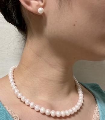 結婚10周年の記念と、私の娘(孫)が大人になったらネックレスを受け継げるようにと、両親がプレゼントしてくれました。 以前にイヤリングをネットで購入したのですが、とても綺麗だったので、今度はネックレスも欲しいと思い、両親、娘と4人でショールームに行きました。 真珠が大好きな私にとっては、たくさんの真珠が並ぶショールームでの時間は、夢のようなひとときでした。 テリ100点の真珠は、それはそれは美しく、多少の傷はありましたが、全く気にならないくらいの輝きを放っていました。 これほどまでに美しい真珠に出会えた私と、それを受け継ぐ娘は幸せだと思いました。 どうもありがとうございました。
