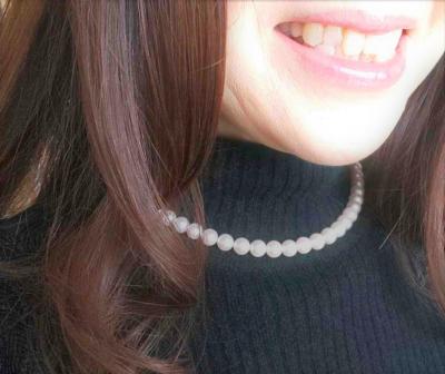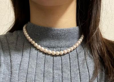 30代になったので、そろそろきちんとしたパールネックレスが欲しいと思い、購入しました。 傷は他人からは絶対に見えないと書いてありましたが、1番真ん中に近い表面にもエクボがあり、少し残念でした。 かなり接近されない限り分からないという意味合いなのだと思います。 ただ、元々テリや色味を優先しての選択だったので、着用すると本当に美しいです。 アレルギー対応のクラスプがあることや、糸替えが不要な耐久性も、決め手となりました。