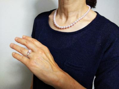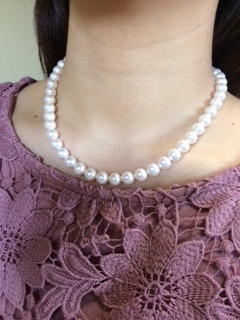 娘への結婚祝で購入しました。 結婚式で初めて着用します。 ほんのりピンク色で艶も良く素敵なお品で満足です。 私のネックレスも無料ワイヤー交換をお願いしようと思います。
