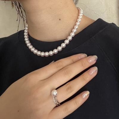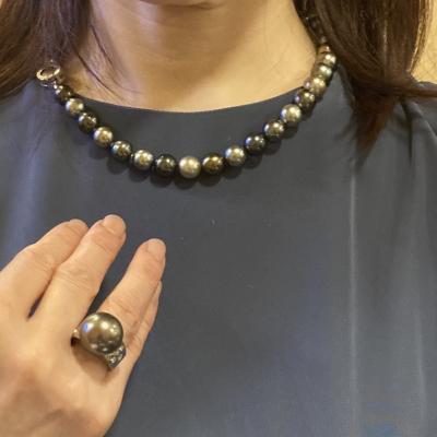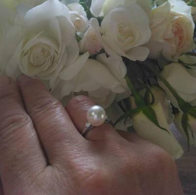 娘のためにお願いしたネックレスとピアスがあまりにもきれいだったので、自分にも指輪がほしくなり、時間をとっていただきました。指輪の台にもいろいろなものがあり、応対してくださった方の白くすらりとした指に、複数はめたりはずしたりしていただいて見比べるという、贅沢な時間の末選んだ金具は、ダイヤのきらめきがすばらしすぎて、肝心の真珠と張り合っていることに気づいて、却下。控えめな、ダイヤが左右に1石ずつの台に決めました。次に珠。ずらりと並んだテリ100点満点の珠の数々ーとても、どれか一つを選ぶことなどできそうもなく・・・ふと、娘のネックレス選びの時のことを思い出し、もう一つ上のサイズの珠を見せていただきました。そのサイズのテリ100点満点の珠は、その場には一つだけでしたが、なんと、お店のサイトの最初に出てくる、夢のような珠とそっくりだったのです! かくして、すばらしい真珠の指輪が、私のところに輿入れしてきてくれました。この指では真珠がかわいそうとは思いながらも、機会あるごとにはめて、将来は娘に譲りたいと思います。楽しい時間とすばらしい指輪を、本当にありがとうございました。